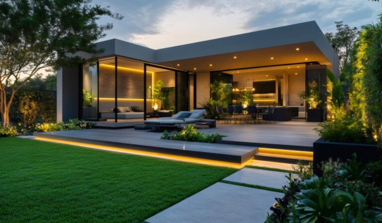Un projet plus ambitieux comprenant une terrasse, un éclairage moderne et un jardin aménagé.